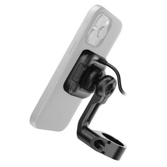 本体は耐水性に優れた頑丈なアルミ製で、ヘッド部分の独自機構によりスマートフォンの揺れや振動を防止します。SlimLink™のハードロックによりしっかりとスマートフォンを固定し、取り外す際にはヘッド部分のプッシュボタンで簡単にロックを解除できます。バイク用グローブを装着した状態でも、スマートフォンの着脱が可能です。